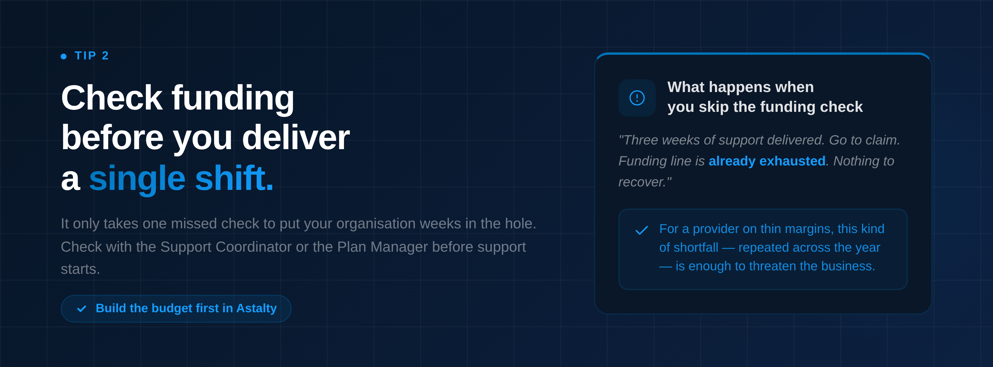 The cost of skipping this step is real. To illustrate: a provider delivers three weeks of support, goes to claim, and finds the funding line already exhausted. Hundreds of dollars of support delivered with nothing to recover.