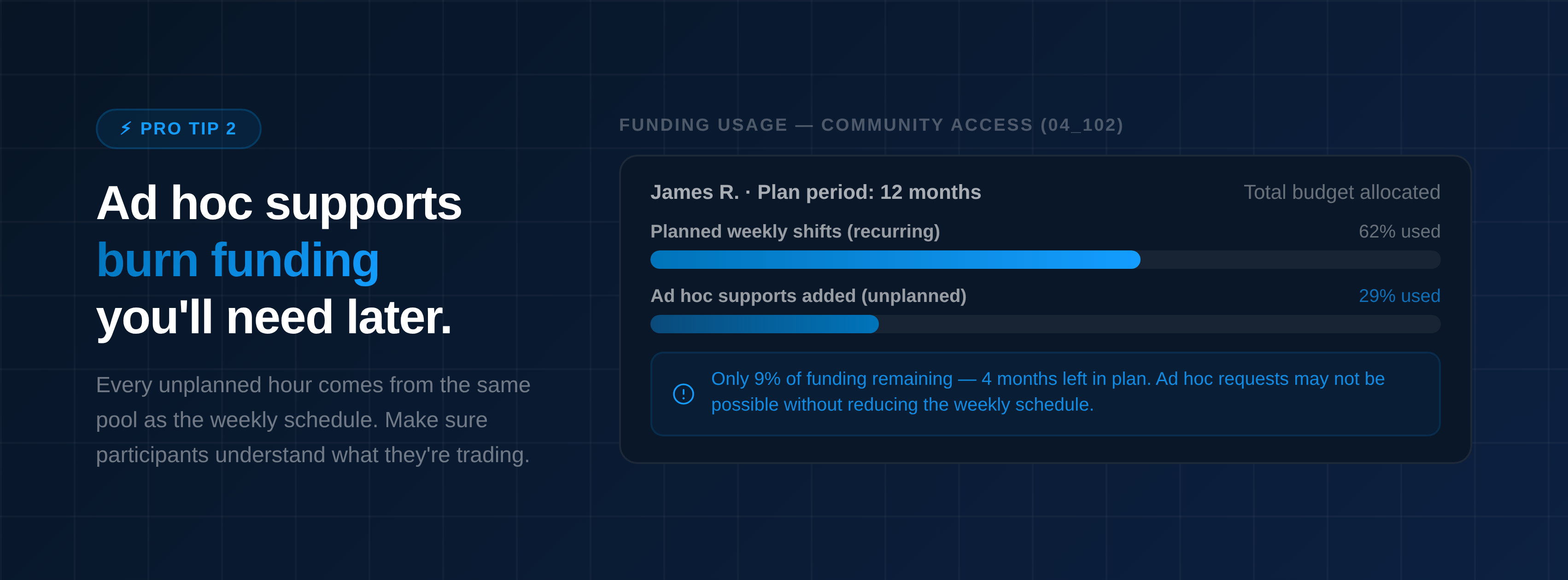 If the participant understands this, they can make an informed decision. If they do not, they will be confused and frustrated when funding runs out before the plan does. Make sure your team can have this conversation clearly and calmly: "We can absolutely look at fitting this in. Just so you know, it will draw from your remaining funding, which means we may need to adjust your scheduled supports later in the plan. Are you happy to proceed with that in mind?"
