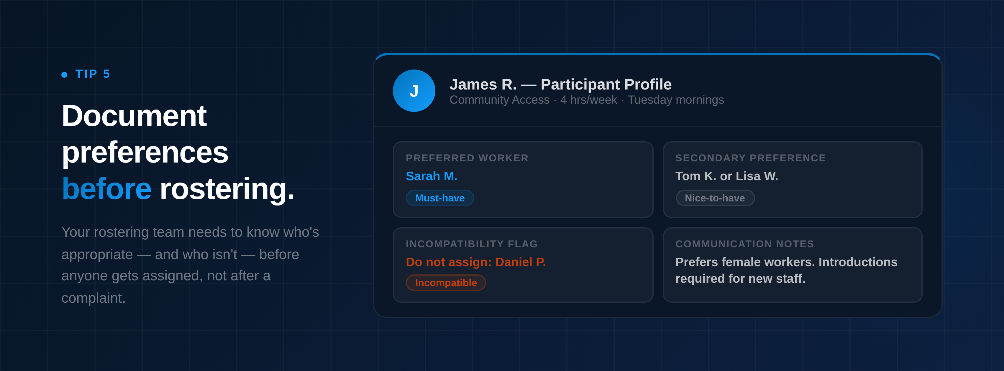 Your rostering staff need to be able to access this information before they assign anyone, not after a complaint has already been made. Make it part of your onboarding process: before the first shift is rostered, the participant profile is complete.