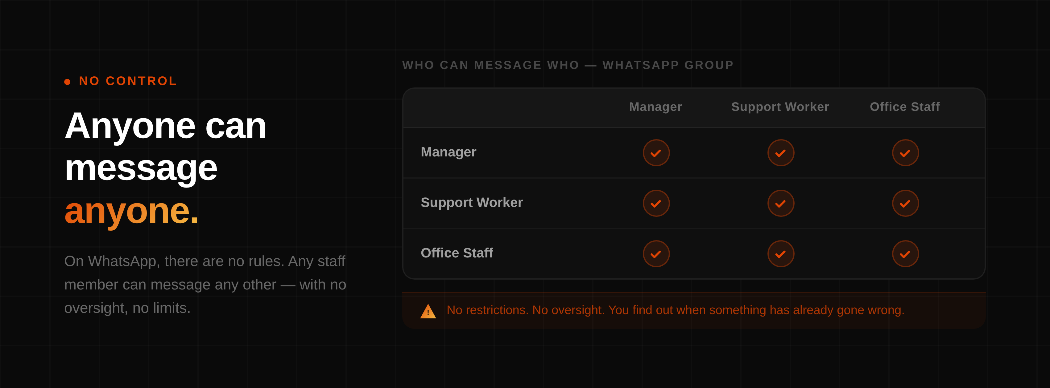 On top of that, you have no control over who's messaging whom. There's nothing stopping a Support Worker from starting a conversation with anyone in the organisation, or from sharing information that should stay between specific people.