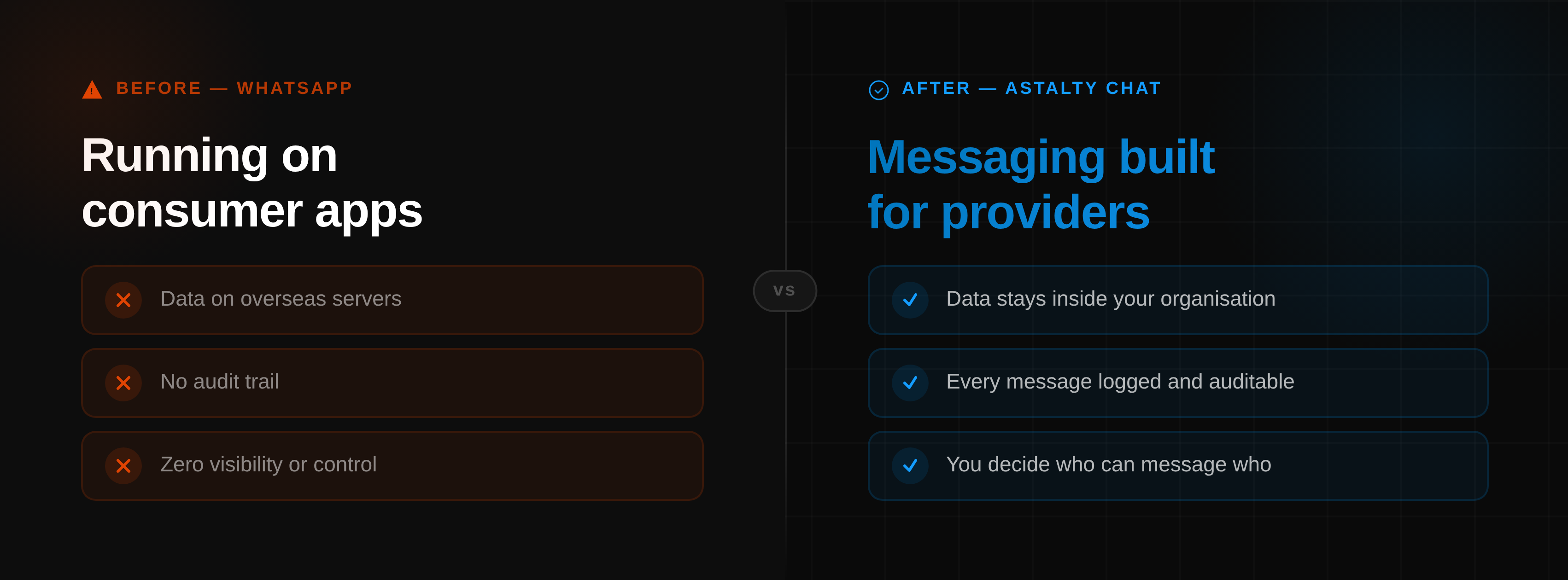 It doesn't rely on personal devices in an unmanaged way. When team communication happens on personal messaging apps, your organisation's information effectively sits on staff members' personal phones with no controls in place. That's a risk most providers don't think about until it matters.