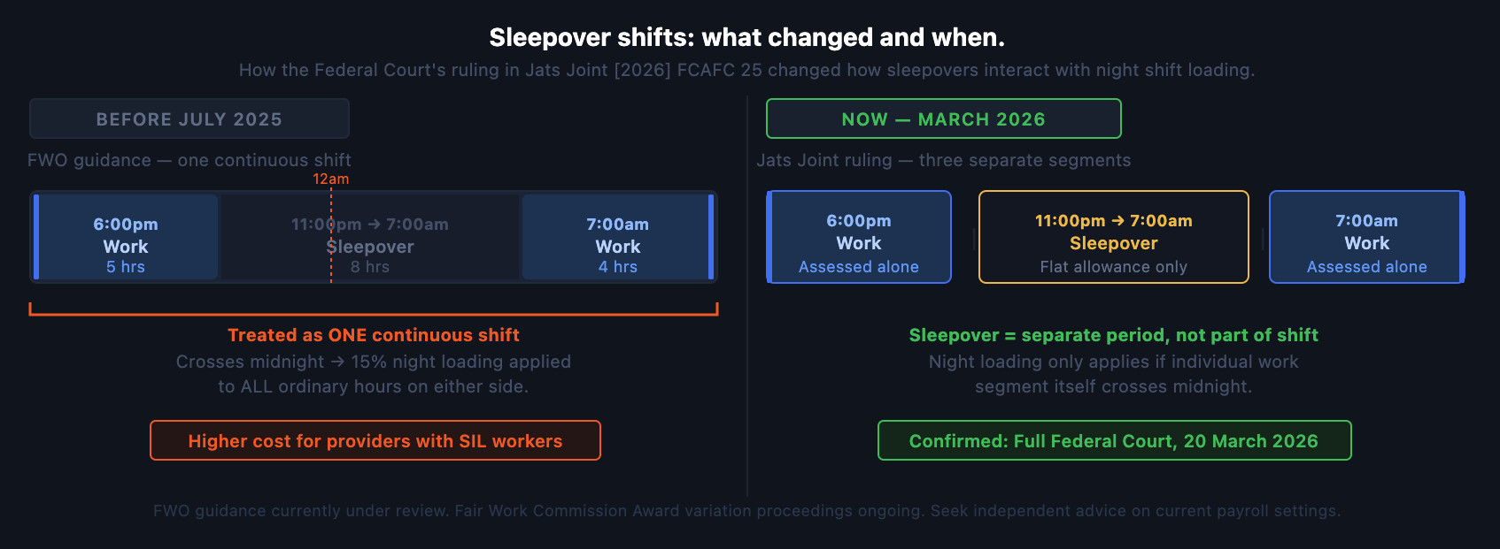 So as of now, the current legal position is that sleepovers don't attract the night shift loading for hours worked on either side. This is the opposite of how many providers have been paying, and the opposite of what the FWO told them to do.